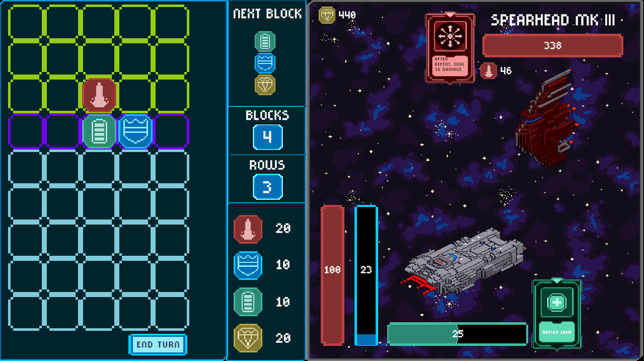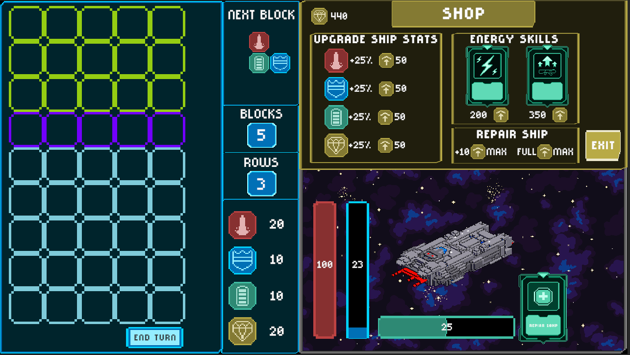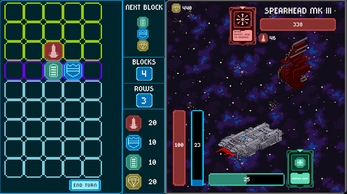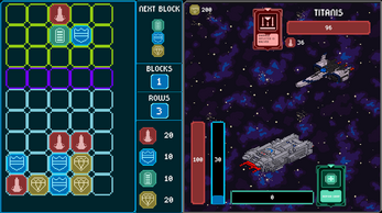 Survive ten escalating waves, upgrade your ship, and repair your systems between battles. Plan your blocks wisely, because every cleared line gives your spaceship the ablity to attack, strengthen the shields, generate money or unleash skills.